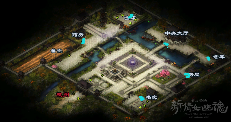 在地图中看到,帮会可以分为中央大厅、金库、仓库、书院、房屋、和药房六大部分,每部分都有其相应的功能。