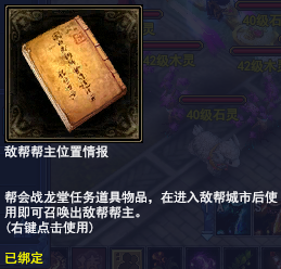 领取任务后,任务包裹获得敌帮帮主情报,,进入目标帮会,右键即可在帮会频道刷出敌对帮主所在坐标,。前往击杀即可。