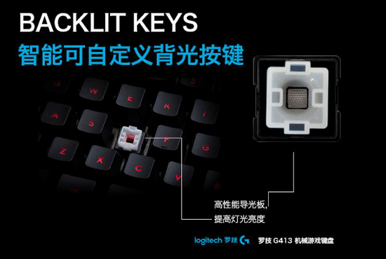 G413所搭载的Romer-G™机械轴具有独特的中心发光方式,使背光光束更加集中明亮,有效降低漏光,从而有助于游戏玩家在比赛中减少误操作,精准取胜。此外G413提供了黑色和银色两种面板颜色可选,分别配备了智能可自定义的元素红和标志白背光,让游戏玩家随心可选,在游戏中魅力四射。
