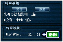 4.当购买传奇战舰之后(需要刷新船厂),在造船厂的舰船信息面板下方会提示有该战舰使用的剩余时间XX小时XX分。当你的战舰使用期限到达被收回后系统在此会提示你距离下次可购买时的冷却时间。