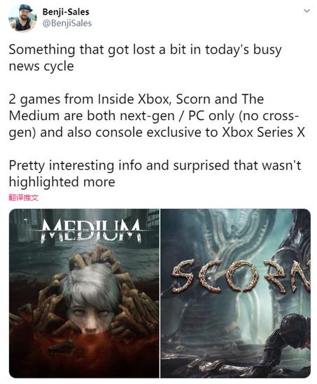 在昨晚的Inside Xbox第三方游戏实机展示会上,有两个游戏已经确认不会登陆Xbox One,只登陆Xbox Series X和Windows 10 PC,它们是《灵媒》和《蔑视》。