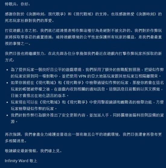 而就在近日,在暴雪的繁中官网上,Infinity Ward在暴雪的繁中官网上发布了关于《使命召唤现代战争》和《战区》打击作弊玩家的公告,公告中表示,官方将把疑似作弊的玩家安排到同一场对战中,并把使用VPN的亚太地区玩家跟其他玩家互相隔离开来。
