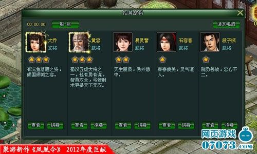 在聚游《凤凰令》的战将系统中,上百位三国人物纷纷登场,演绎出一场全新的风云争霸。与其他游戏中玩家只能携带武将的设定不同,聚游《凤凰令》中除了知名武将之外,还提供给玩家更多元的家将选择,华佗、左慈、于吉、貂蝉等武力值较低的人物,会拥有独特的技能,带给玩家不一样的惊喜。随着等级的提高,玩家的战将携带数也会逐步解封,让你在三国之中打造出一支真正的精兵强队!
