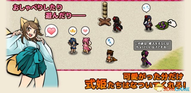 玩家可以建造属于自己的庭院,和式姬们一起讨伐各地出现的妖怪。战斗系统融入卡牌战斗和庭院的场景要素,可以培养式姬,强化卡组,搭配庭院里不同的装饰品和建筑物组合出不同的攻击效果。