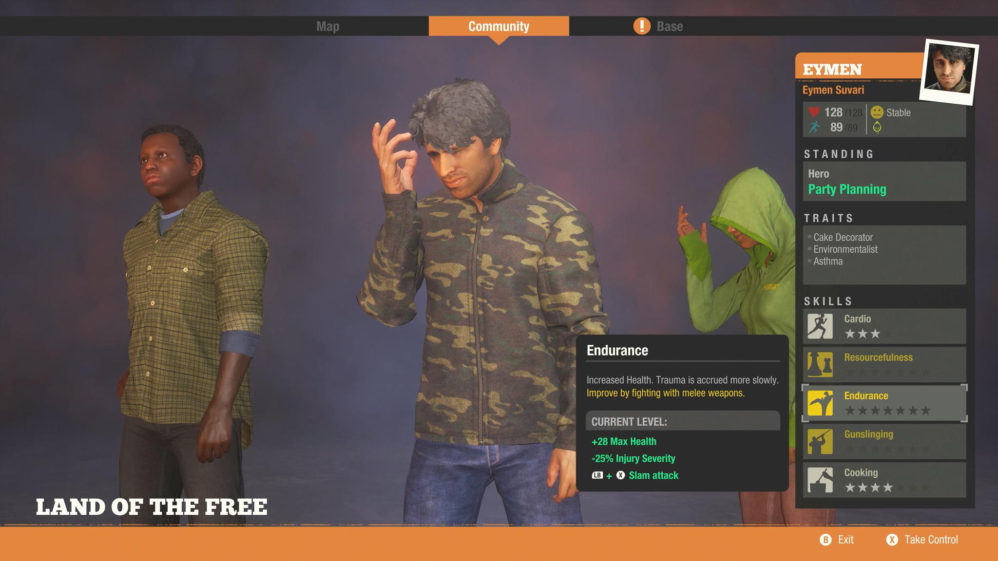 接下来是艾莉森(Allison),演示中的艾莉森刚经历了一场战斗,状况很不好。这样的现状会和角色本身的特质相互影响,继而影响整个团队。艾莉森对这个世界的状况感到忧愁,爆发的丧尸潮以及食品药品短缺都让她心烦意乱。她喜欢瞭望塔,瞭望塔能给她安全感。而作为一名英雄人物,她也能给团队带来士气——大家都觉得和艾莉森比起来,自己还是很有精神的。