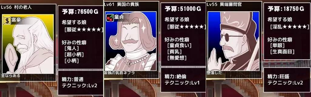 比如会有一把年纪的“村中老人”跑来,正想感慨老人家老当益壮,一瞥需求写着“小柄”甚至“超小柄”(指对象的身体尺寸),微妙的喜感油然而生。再比如“年轻的贵族”,很有钱,哪儿都好,为啥还要来风俗场?一看备注是“童贞”…感觉这是作者在揶揄那些不会陪伴女性,事业有成就行的男性。总之,一眼扫过这些描绘的字面之下,仿佛藏着无数有趣又细思恐急的故事呢。