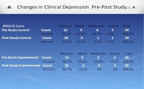 数据显示:患上中度至严重的抑郁症转移轻度抑郁症,与此同时,有轻微的抑郁症人数的数目从9下降至4。中度抑郁症人数和严重抑郁症人数都降至0,转化为轻度抑郁症。